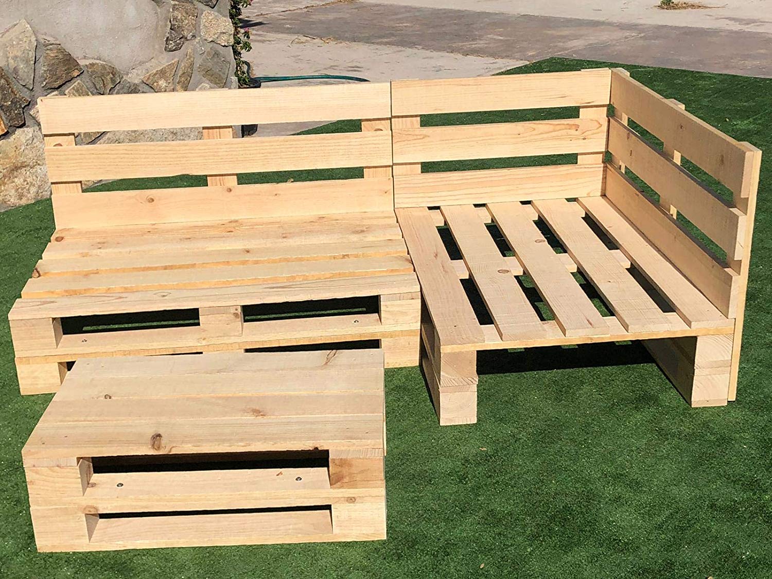 Conjunto de sofás + mesa auxiliar realizados en palets nuevos a estrenar, de color natural y con tratamiento anti-bacterias. La madera viene directa del aserradero sin barnizar.